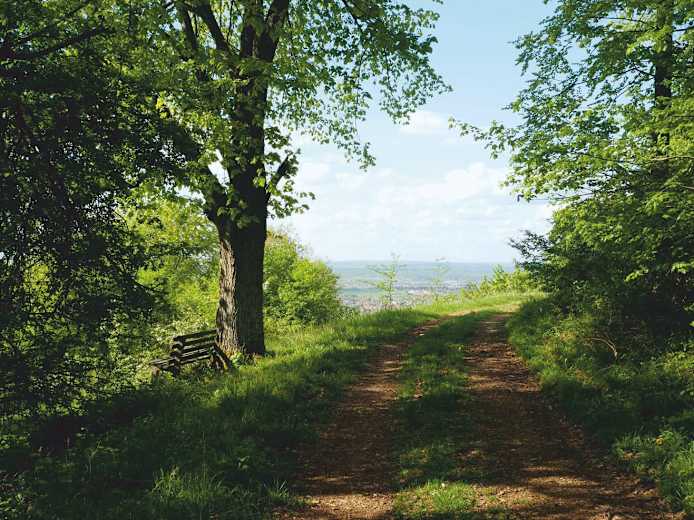 Auf diesem geht es nach links in den Wald hinein. Bereits nach 300 Metern gabelt sich der Weg wieder. Das Streuobstwegle zweigt nach rechts ab. Bald ist am Waldrand eine weitere Infotafel erreicht, die auf die Sukzession aufmerksam macht. Eine Panoramaliege und eine Bank laden zum Genießen der Landschaft ein. 10 Meter weiter führt ein Pfad dazu hinab.