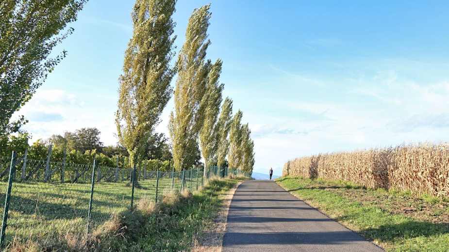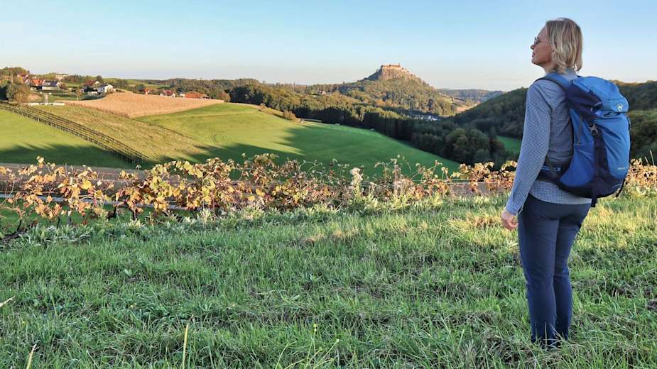 Der Wanderweg führt rechts der Straße entlang bis zum Kulinarium, wo wir uns wiederum rechts halten, um über Wiesen- und Waldwege bergab zu gehen. Am Talboden angekommen, halten wir uns rechts und folgen der Asphaltstraße. Wir sehen die Riegersburg direkt vor uns, gehen bei der nächsten Kreuzung links und zweigen kurz darauf rechts in den Wald ab. Ab nun geht es bergauf durch ein herrliches Waldstück. Bei einer Asphaltstraße angekommen, halten wir uns links und wandern der Straße entlang von Obst- und Weingärten. Nachdem es leicht bergab gegangen ist, zweigen wir bei der nächsten Kreuzung rechts ab. Der Ausblick überzeugt uns, da man auf der einen Seite die Riegersburg und auf der anderen den Schöckl sehen kann.