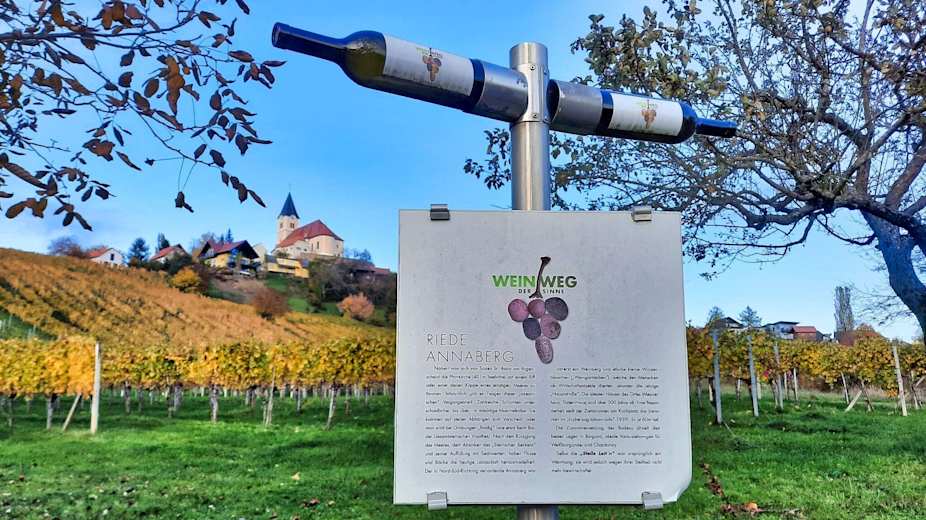 Wir wandern nun weiter in Richtung Osten und genießen die Aussicht auf die gepflegte Kulturlandschaft. Durch den Wald und beim Höllischgraben mit div. Skulpturen vorbei, erreichen wir die Straße bzw. den Bergheurigen Grenzlandhof. Jetzt noch gemütlich dahin bis zu unserem Ziel, die Aussichtswarte mit dem Gasthaus Hendlwirt. Hier kann man gemütlich eine Pause machen und die grandiose Aussicht auf dem Turm genießen. Der Rückweg führt gleich bei der Straße, unterhalb des Gasthauses, weiter. Nach wenigen Minuten zweigt der Wanderweg rechts nach unten weg. Der Weg führt vorerst durch ein Waldstück und in Folge entlang kleiner Siedlungen mit gepflegten Weingärten. Ab nun sind wir hauptsächlich auf Straßen unterwegs und orientieren uns an den zahlreichen Bodenmarkierungen bzw. den Weinflaschen-Wegweisern. Bei dem Rastplatz „Alte Presse“ in Stradenberg vorbei, wandern wir aussichtsreich im leichten Auf und Ab durch die Kulturlandschaft bis wir rechts die Aussichtsplattform „Über den Reben“ erreichen. Über den Holzsteg und weiter bergab durch den Weingarten, erreichen wir alsbald den Talboden. Wir überqueren die Straße und wandern nun ein Stück leicht bergauf, um zu Holunderfeldern zu gelangen. Der Weg führt nochmals leicht bergab, über den Bach und ab nun kontinuierlich bergauf, wobei wir ein Stück parallel zur Straße gehen. Links zweigen wir in eine Seitengasse ab, um das letzte - etwas steile - Stück bis zur Kirche zu gehen. Nun nur noch wenige Höhenmeter und wir erreichen unseren Ausgangspunkt.