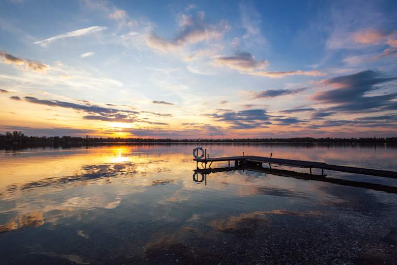 Wir starten im Nordwesten des Sees, folgen dem Uferweg über die Westseite in den Süden durch den „Park am See“, passieren Strandbad, Fun- und Spielplätze sowie Campingplatz und setzen den Rundweg an der Ostseite bis zum Ausgangspunkt im Norden fort. Die meist flache Ufertrasse mit abwechslungsreicher Vegetation, Badestränden und Blick auf die Wasserski- und Wakeboard-Anlage eignet sich ideal für entspannte Spaziergänge und gemütliche Wanderungen ohne größere Höhenunterschiede.