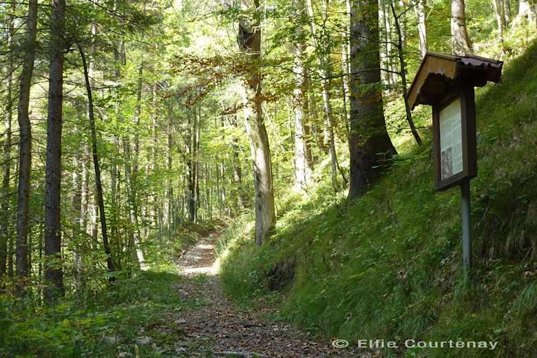 Wir folgen ihr, bis sie sich gabelt, und gehen rechts. Kurz darauf kommen wir an die Ettaler Straße, die wir überqueren (Vorsicht, Verkehr!) und folgen nun dem Wegweiser „Alte Ettaler Straße“. Wir halten uns zuerst links und dann wieder rechts. Der Weg windet sich als Pfad neben dem Bach entlang. Wo er aufhört, führt ein Steg über den Bach, auf der anderen Seite gehen wir nach rechts auf einem Kiesweg weiter. Schon kurze Zeit später überqueren wir den Bach noch einmal und befinden uns nun auf der „Alten Ettaler Straße“. Diese führt bei der nächsten Weggabelung rechts, wir aber folgen dem linken Weg.