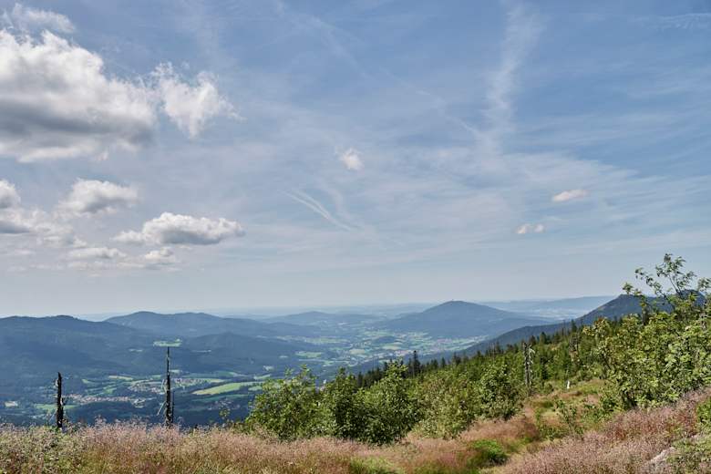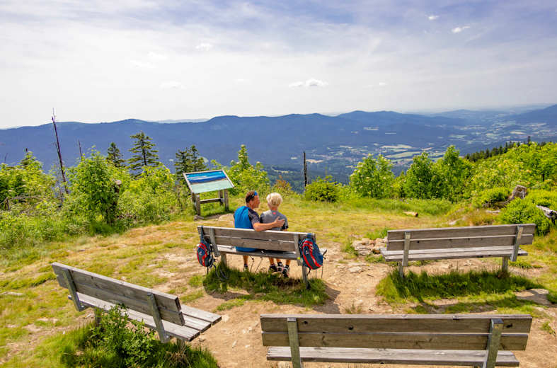 Oben angekommen wartet das „Naturkino“ - 20 Logenplätze mit einer beeindruckenden Aussicht auf den Großen Arber, das Osser-Massiv und das weite Tal des Lamer Winkels. Ideal für Naturfreunde, die etwas Kondition mitbringen.