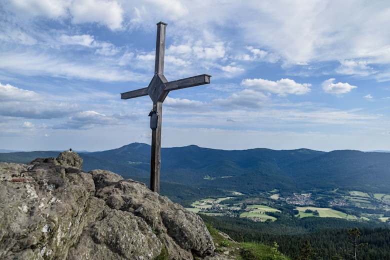 Eine abwechslungsreiche Wanderung auf dem Künischen Grenzweg zum Großer Osser: sanfte Feldwege, Forststraßen und ein anspruchsvoller Aufstieg durch den Wald führen zum Gipfel mit atemberaubender Aussicht im Bayerischen Wald. Unterwegs warten das Panorama, historische Marterl, die Künische Kapelle, das Osserschutzhaus, der Teufelstritt und das Bergkircherl Maria Hilf – eine Tour voller Naturerlebnisse und Entdeckungen.