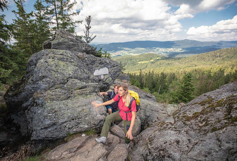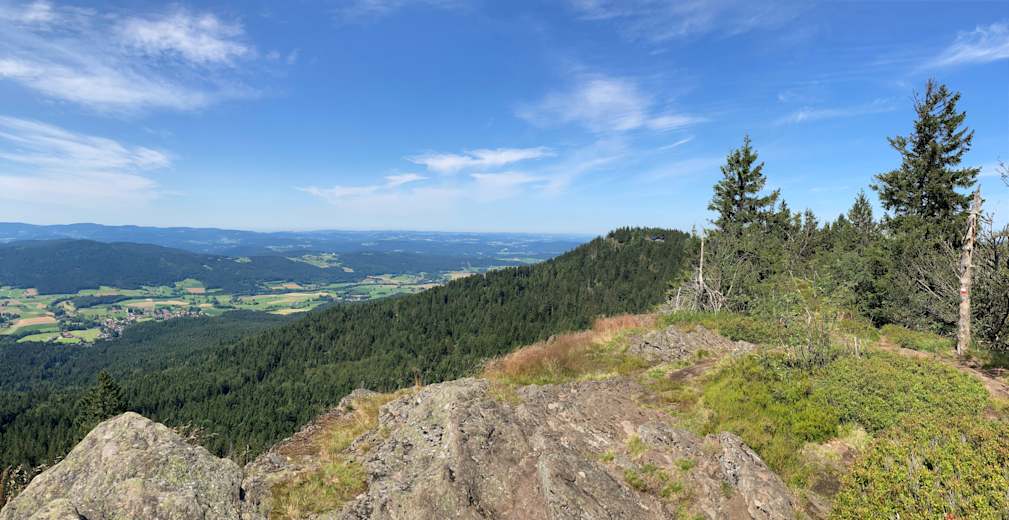 Weiter folgt man dem Goldsteig in Richtung Kötztinger Hütte. Entlang des Höhenkamms geht es nun wieder zurück über das Steinbühler Gesenke, zu den Rauchröhren (1.042 m) und über den Großen (1.132 m) und Kleinen Riedelstein (1.042 m).