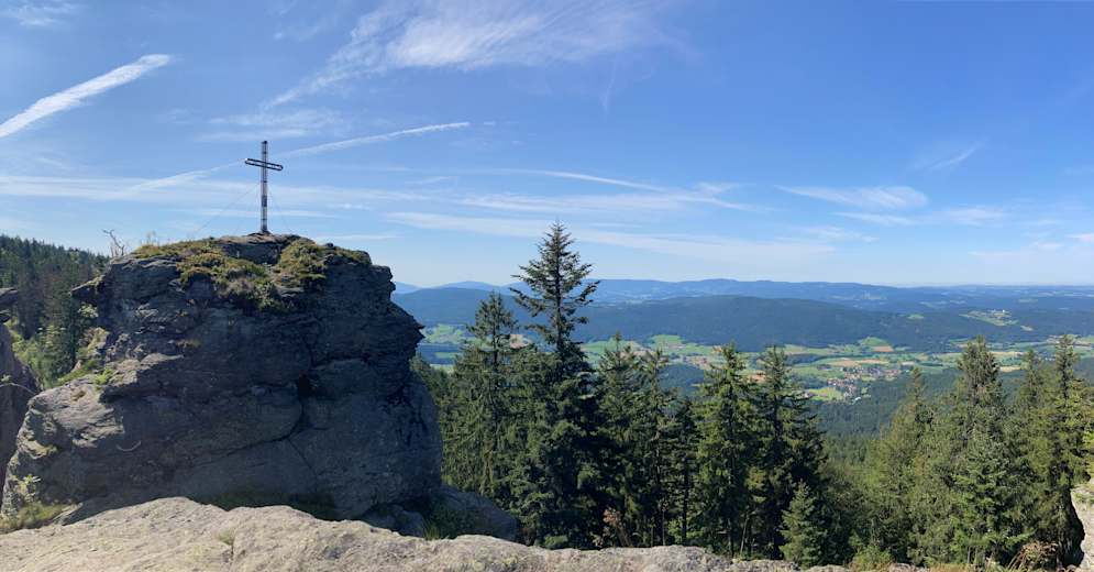 Nachdem man die Ortslage verlassen hat, wandert man über reizvolle Wald- und Wiesenwege hoch zum Bergkamm. Oben angekommen, bieten sich atemberaubende Panoramablicke auf die umliegenden Täler und Bayerwaldberge. Die Kammwanderung verläuft vorbei an den markanten Felsen der Rauchröhren sowie am Waldschmidt-Denkmal auf dem Riedelstein.