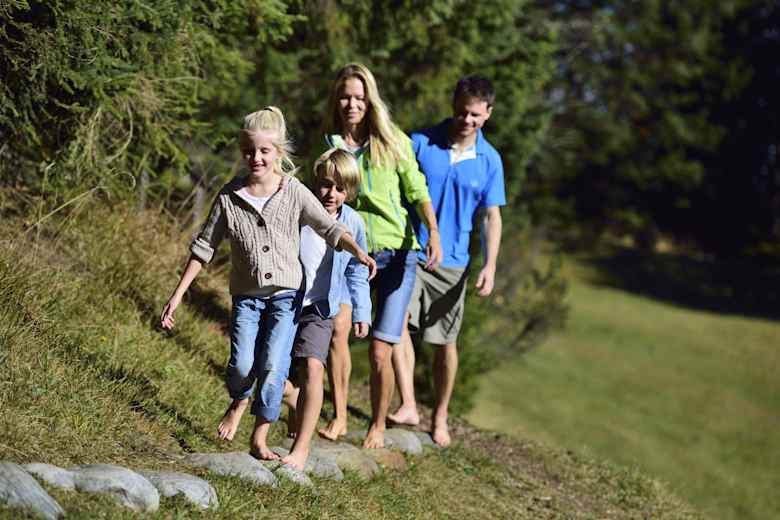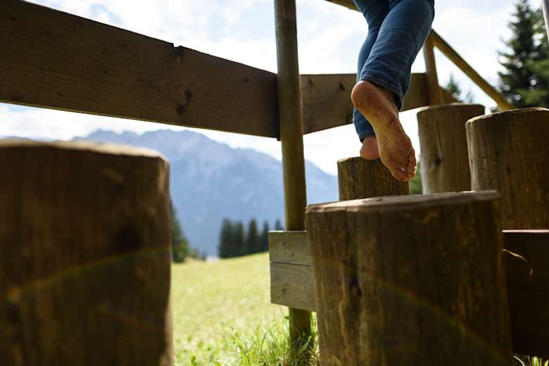 Wie fühlen sich Tannenzapfen, Moos, Kieselsteine oder auch Baumrinde ohne Schuhe an? Der Barfußwanderweg am Hohen Kranzberg in Mittenwald in Bayern ist eine der abwechslungsreichsten Unternehmungen für die ganze Familie. Groß und Klein können an den zahlreichen Stationen der leichten Rundwanderung den Untergrund barfuß erfühlen und am Ende wartet eine feine Einkehrmöglichkeit. Den Ausgangspunkt des Barfußweges erreicht man bequem mit der Kranzberg-Sesselbahn.
