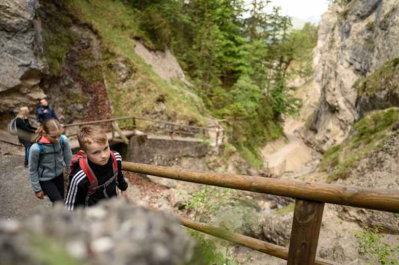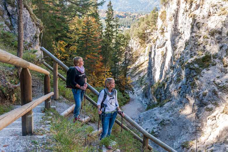 Schöne, leichte Wanderung durch die beeindruckende Hüttlebachklamm bei Krün in der Alpenwelt Karwendel. Die Tour führt zuerst durch die Klamm zu einem schönen Aussichtspunkt, von dem man ins obere Isartal blicken kann. Danach wandert man durch den ruhigen Wald retour zum Ausgangspunkt, der Ortsmitte Krün.