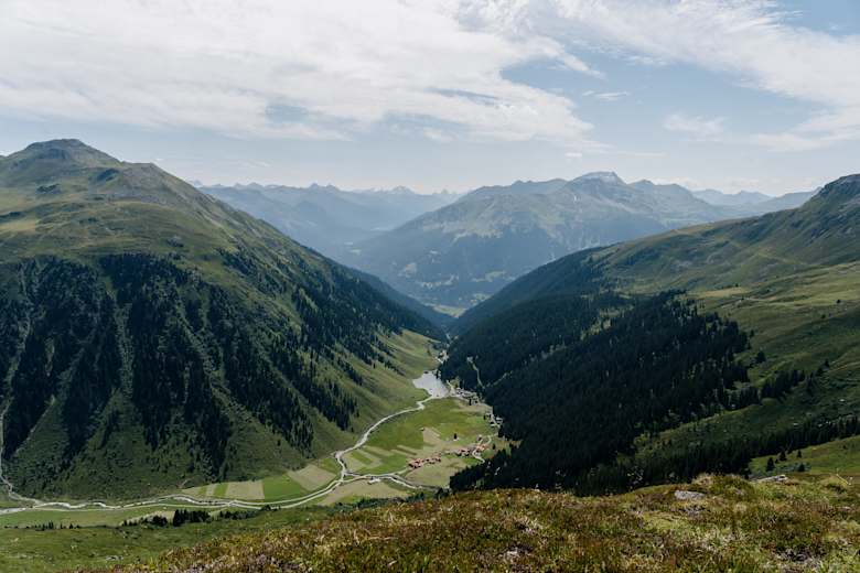 Im Abstieg geht es weiter auf Weg Nr. 30 vorbei am Schlappiner See ins Bergdorf Schlappin und schließlich wahlweise über einen Wald- oder einen Forstweg nach Klosters, wo man nächtigt.