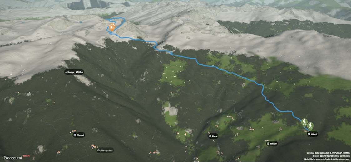 Am Südgrat befinden sich Sicherungen, an denen man hinab zur Heiligkreuzhütte (2.305 m) steigt. Von dort geht es wieder auf einem angenehmen Wanderpfad zur Klausner Hütte zurück. Über die Forststraße gelangt man zum Ausgangspunkt, dem Parkplatz Kühhof.