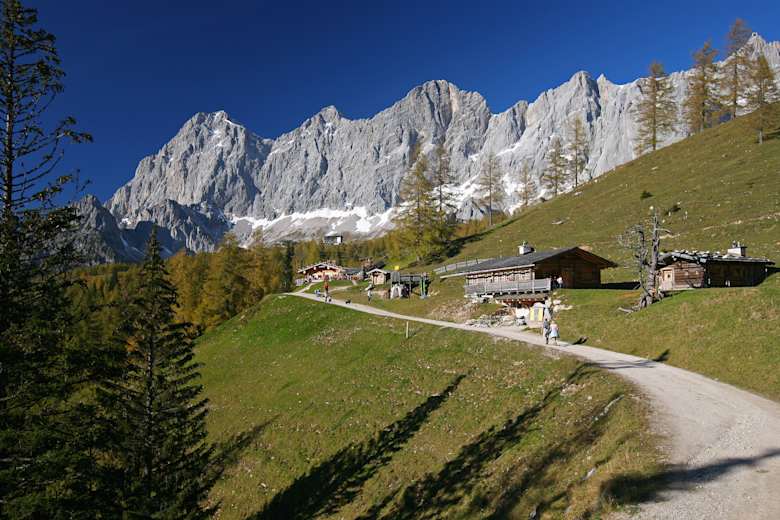 Über die Brandalm, Ramsauer Alm, Südwandhütte, Neustattalm und Walcheralm verläuft dieser Rundweg in der Dachstein-Region. Abwechslungsreich und imposant ist dieser Ausflug nicht nur für (konditionsstarke) Kinder, führt der Weg doch unterhalb der Dachstein-Südwände vorbei.