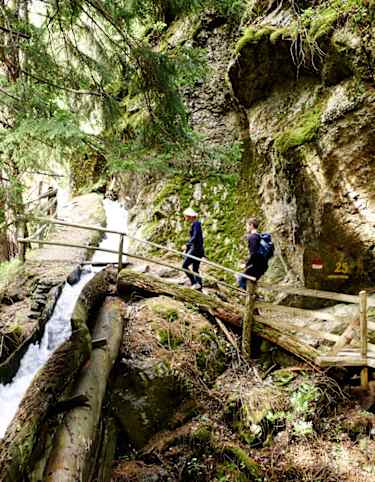 Der Agumser Bergwaal hat einen altertümlichen Charakter. Startend von Prad geht es in Richtung Agums zur oberen Suldenbachbrücke.