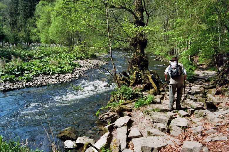 Die Tour startet an der Drei-Schluchten-Halle in Bachheim und ist gut mit Kindern zu bewältigen. Der Weg führt hinab in die Wutachschlucht und dann flussabwärts bis zur Gauchachmündung. Auf diesem Wegstück befindet sich das Wahrzeichen der Schlucht - die eindrucksvollen Felsengalerien. An der Mündung überquert man eine überdachte Holzbrücke, den Kanadiersteg.