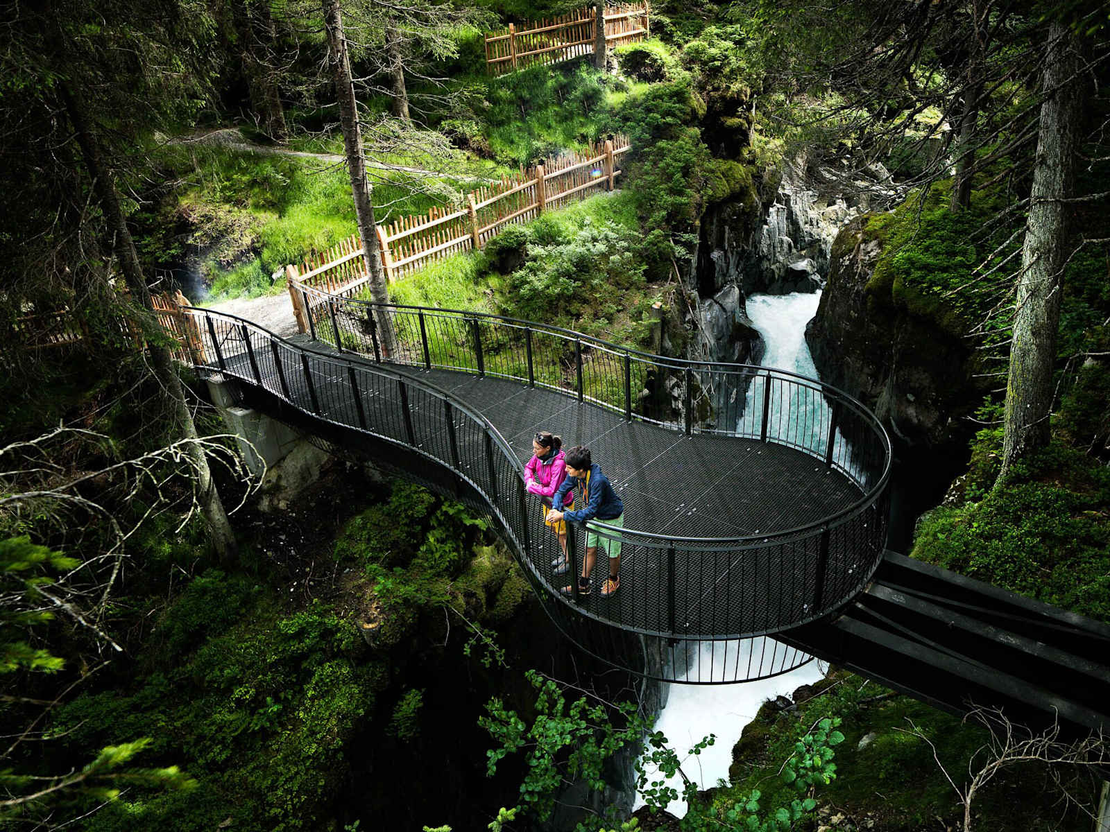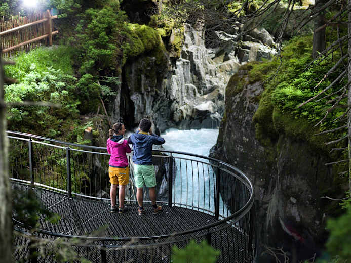 Folgt man dem WildeWasserWeg, ausgehend von der Wilde Wasser Arena taleinwärts, so könnten die Gegensätze nicht größer sein. Wandert man zunächst noch am Ufer des gemächlich fließenden Ruetzbaches, ist man im nächsten Moment umgeben von tosenden Wassermassen. Zwei, teils über dem Abgrund hängende Plattformen als auch ein Holzsteg vermitteln eindrucksvoll die unbändige Kraft des Baches. Dank dieser Naturgewalt ist die spektakuläre Schlucht mit kleinen Wasserfällen und Stromschnellen entstanden. Am Ausgang des Katarakts, wie eine durch Blöcke und Felsriegel gegliederte Stromschnelle bezeichnet wird, gelangt man zur urigen Tschangelair Alm. Hier bietet sich die Gelegenheit, noch eine kurze Rast einzulegen, bevor es zum Endpunkt der ersten Etappe geht. Die Umgebung ist durch eine dichte Aufeinanderfolge von Lawinengängen und Murbrüchen geformt und weist die speziell dafür angepasste Vegetation auf: Beerensträucher und talwärts gedrückte Birken, dazwischen oft schmale Fichtenstreifen.