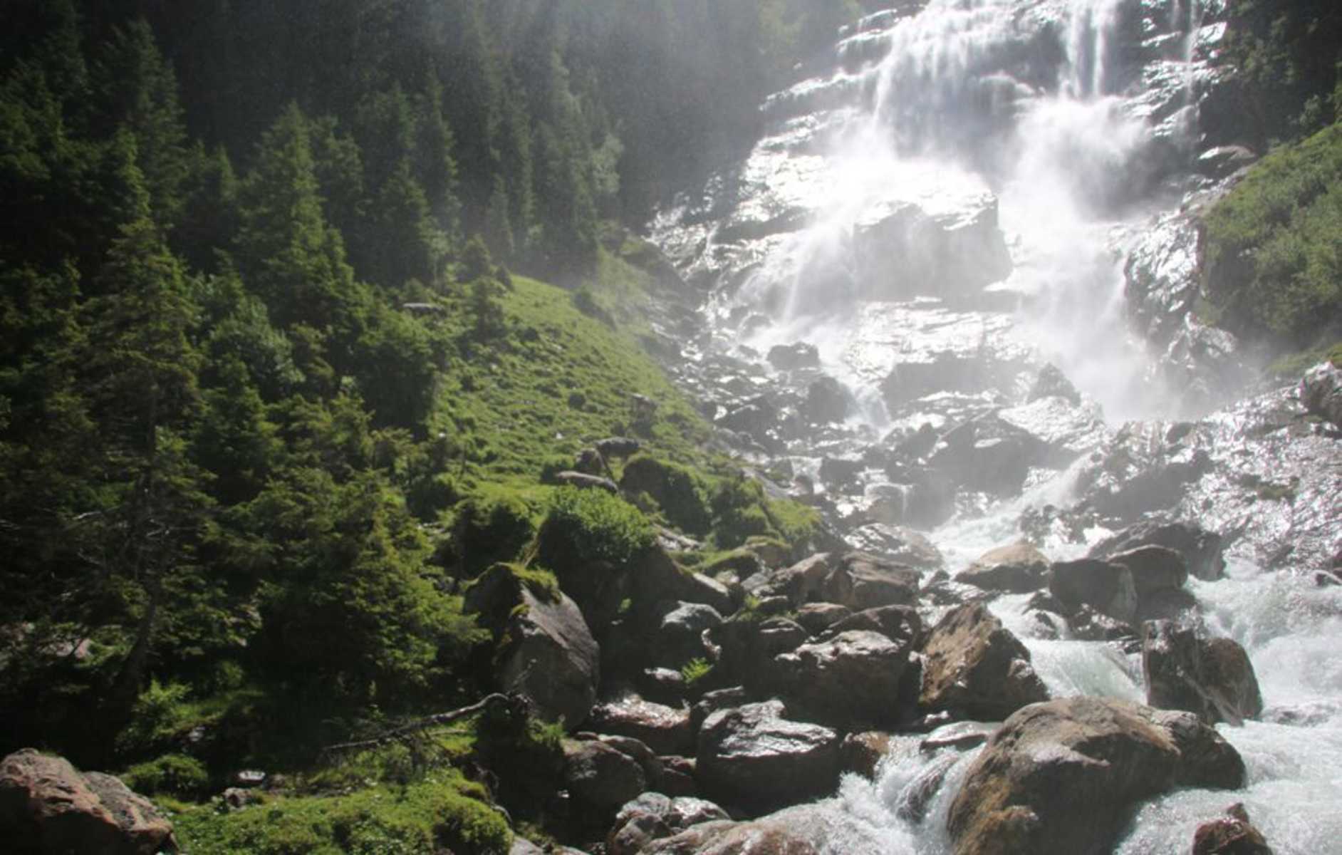Recht unvermittelt öffnet sich nach einer Wegbiegung der Blick durch die Bäume auf den imposanten Grawa Wasserfall, dem Herzstück des WildeWasserWeges. Breitester Wasserfall der Ostalpen und Naturdenkmal – die Superlative reichen sicher nicht aus, um die wilde Schönheit dieses Wasserfalls zu beschreiben. Je nach Wassermenge verändert der Grawa sein Erscheinungsbild entscheidend. Im Spätherbst sehen wir nur einen eher spärlichen Streifen im rechten Teil. Im Frühsommer bei der Schneeschmelze und insbesondere nach starken Regenfällen zerteilt sich der Wasserschwall oberhalb der Fallstufe auf eine breite Fläche. Treppenartige Kaskaden, wehende Wasserschleier, tosende und gischtende Wasserschwälle – all das kann hier beobachtet werden.