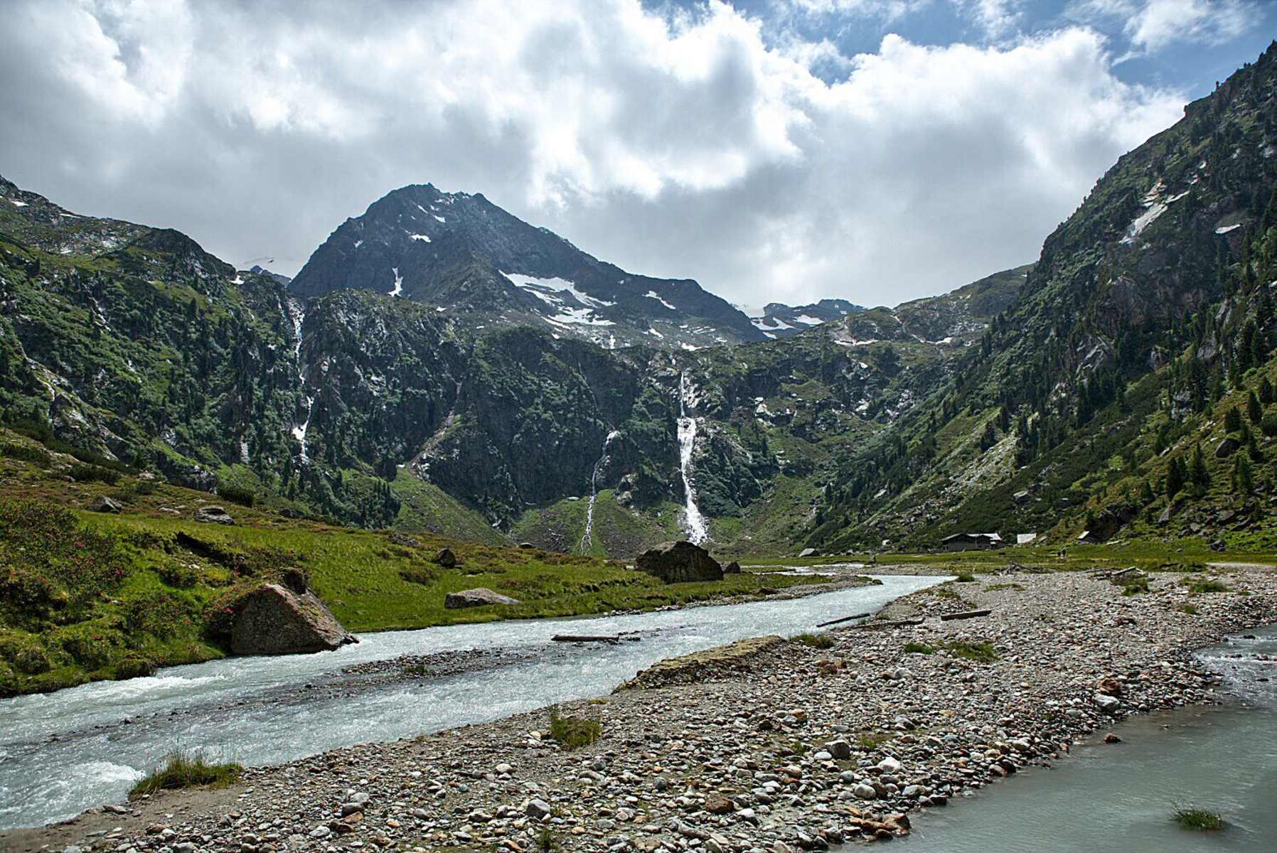 Nach etwas mehr als einer Stunde Gehzeit erreicht man das Sulzenegg (1.800m) von wo es fast eben durch den gewaltigen, von den 3 Wasserfällen und reich verzweigten Mäandern geformten und dominierten, Talkessel mit Gletscherblick  zu Sulzenaalm geht.