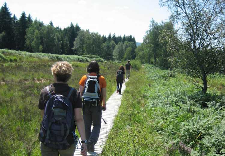Holzstege führen durch das beeindruckende Biotop. Weiter geht es vorbei an ders Dreilägerbachtalsperre bis nach Roetgen, dem „Tor zur Eifel“.