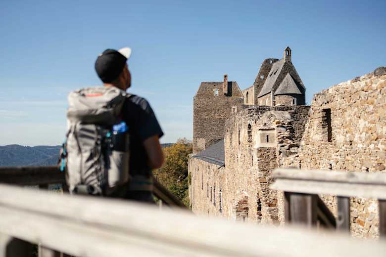 Von der Hammerschmiede in Aggsbach Dorf, wo unsere Etappe startet, gehen wir weiter bis zur Kreuzung. Gegenüber vom Wirtshaus „Zur Kartause“ biegen wir nach links ab und beginnen den Anstieg zur Burgruine Aggstein. Vorbei am Pestkreuz gelangen wir zum Parkplatz der Ruine Aggstein und wandern anschließend weiter bergauf durch den Herrenwald und den Aggsteingraben bergauf. Die Ruine stammt aus dem 12. Jahrhundert und war u.a. Sitz der Kuenringer und des Raubritters Georg Schreck vom Walde. Die Burg gehört wegen ihrer imposanten Größe und der historischen Bedeutung zu den wichtigsten Burgen Österreichs. In der Ruine lädt eine Taverne zur Einkehr ein (Eintritt).