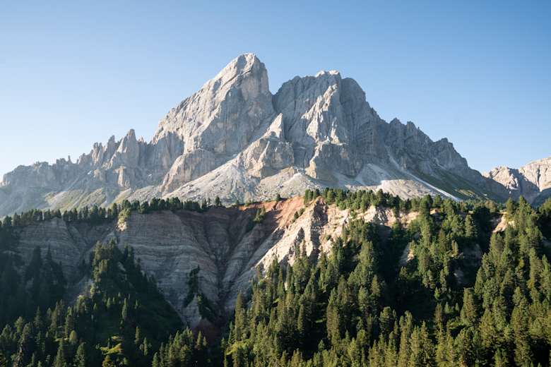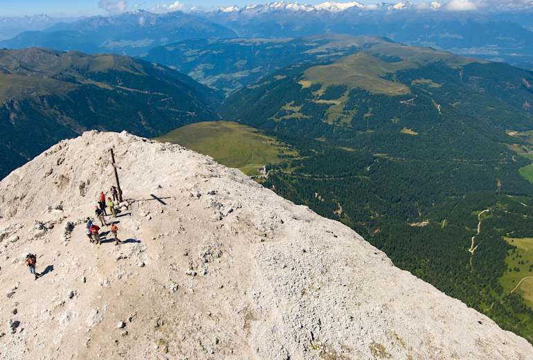 Der Peitlerkofel in der Region Alta Badia ist ein alleinstehender Gipfel in Südtirol oberhalb des Würzjochs am nordwestlichen Rande der Dolomiten. Er liegt umgeben von Hochalmen in einer geradezu märchenhaften Umgebung und ist relativ einfach zu besteigen - der letzte Gipfelaufschwung ist allerdings eine Klettersteigpassage in der Schwierigkeit A/B und verlangt Trittsicherheit und Konzentration. Von seinem Gipfel hat man vielleicht die beste Rundumsicht der Dolomiten überhaupt.