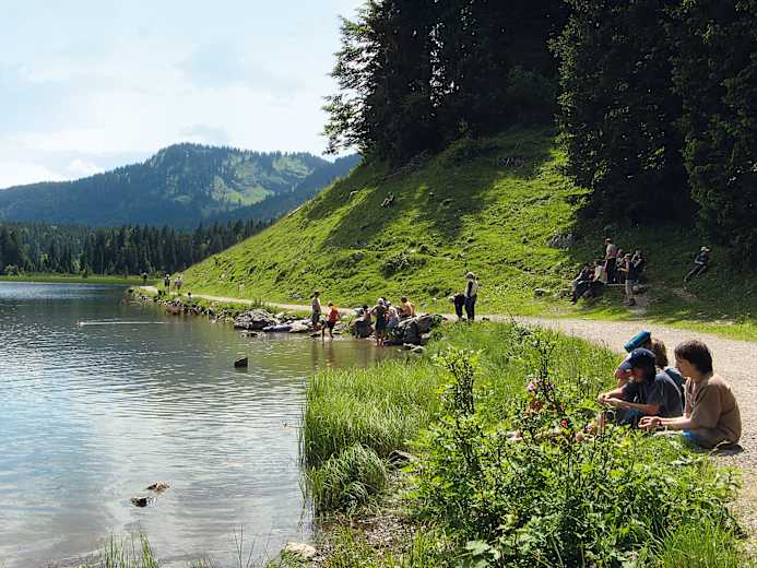 Der Bergsee besticht durch sein klares Wasser und die Kulisse des Mangfallgebirges. Im Sommer erwärmt er sich auf erfrischende 18 Grad. Baden ist an mehreren Stellen möglich, für Kleinkinder ist der Zugang zum Wasser jedoch eher zu steil. In rund 50 Minuten haben wir den See umrundet und treffen wieder beim Arabella Alpenhotel ein. An der Seepromenade kommen wir an einem schönen Kinderspielplatz vorbei, an dem sich eine kurze Rast lohnt. Wer nur eine kleine Runde gehen will oder die holprige Passage zu Beginn des Sees vermeiden möchte, läuft nur den ersten Teil der Strecke vom Parkplatz über die Albert-Link-Hütte zur Klausenalm. Danach kann man gemütlich an der Seepromenade zum Kinderspielplatz flanieren.