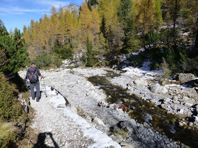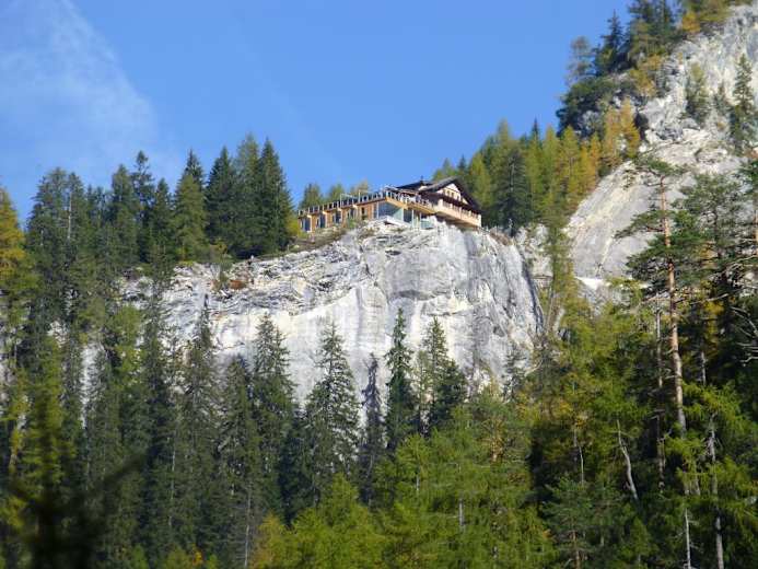 Für den restlichen Weg gibt es zwei Möglichkeiten: Entweder über den Forstweg zum Ausgangspunkt und Parkplatz (zum Teil etwas eintönig) abwärts oder auf dem Steig. Letzterer ist zwar etwas anspruchsvoller, aber natürlich auch interessanter. Einfach den Schildern folgen. Dieser Steig quert immer wieder den Forstweg. Ziemlich gegen Ende der Tour (restliche Gehzeit ca. 1/2 Stunde) führt der Weg über eine Brücke, wo ein kleiner Wasserfall kleine Gumpen gebildet haben. Die müden Zehen werden es euch danken, wenn sie rasten und ins kühle Nass dürfen. Wenn sich der Wald lichtet, zeigt sich etwa 500 Höhenmeter weiter oben die Dolomitenhütte noch einmal in ihrer vollen Pracht auf dem Felsen thronend. Kurz vor dem Parkplatz wird die Hirschbrunn Quelle passiert, dort ist auch ein sehr einladender Picknickplatz.