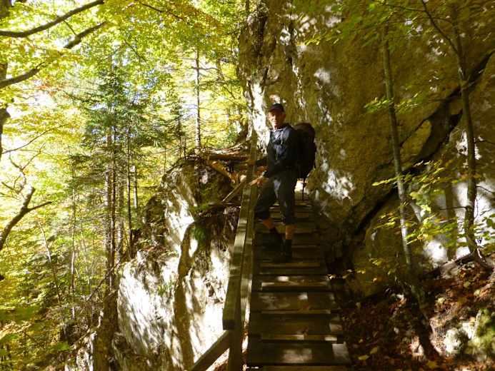 Vom Parkplatz (1.100 m) führt der Weg gleich spektakulär über das Naturdenkmal Klammbrücke, dort wo der Bach sich eine dichte Schlucht gegraben hat. Gleich nach der Brücke nach links auf den Franz-Lerch-Weg (Nr. 10a). Im leichten Auf und Ab geht es durch einen sehr schönen Buchenwald.