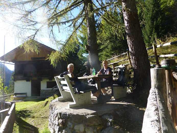 Nun geht es stetig aufwärts, zum Teil auch etwas steiler. Ca. 1 1/4 - 1 3/4 Stunden nach der Klammbrücke kommt man zur idyllisch gelegenen Amlacher Wiesenhütte, einer privaten Jagdhütte, wo ein Brunnen etwas versteckt neben der Sitzgruppe liegt. Der Weiterweg folgt dann einer Forststraße nach rechts bis zu einer Asphaltstraße, der man weiter aufwärts bis zum Parkplatz (mit Bushaltestelle) folgt. Von hier sind es nur noch wenige Minuten bis zur Dolomitenhütte (1.620 m).