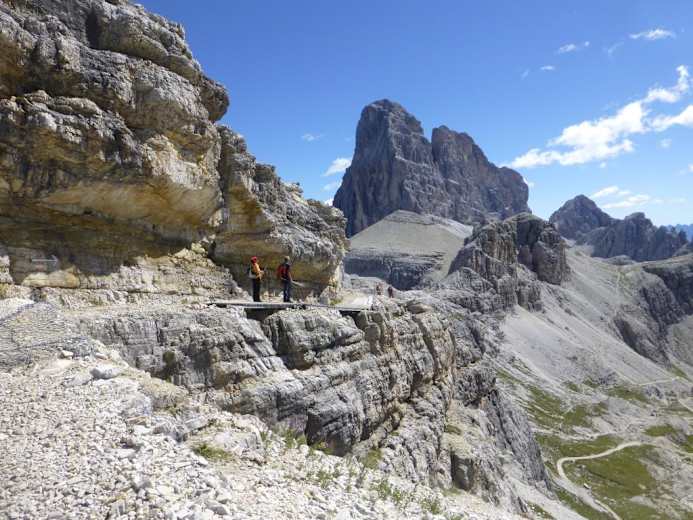 Der Weg zum Bülleljoch verläuft vorerst noch relativ eben, entlang eines in den Felsen geschlagenen Felsbandes. Schon relativ bald hat man einen wunderschönen Blick auf weitläufige Almböden und den sehr massigen Toblinger Knoten. Vom Büllelejoch kann man auch direkt zur Drei-Zinnen-Hütte gehen (Weg Nr. 101, 50 Minuten, schmaler Pfad über Geröll, zum Teil etwas steil).