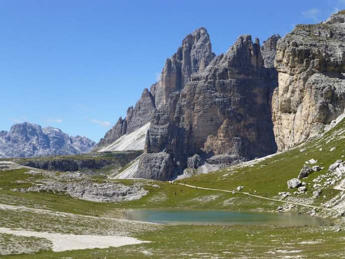 Dieser Weg (Nr. 104) führt aber auf der anderen Seite über Serpentinen abwärts, bis zu den grünen Böden unterhalb des Monte Cengia mit einem wunderschön gelegenen, gleichnamigen See, der zum Verweilen einlädt. Der Weiterweg führt immer gut markiert aufwärts, an den Lavaredo Seen vorbei, bis zur Abzweigung, wo der Weg Nr. 101 einerseits nach rechts über den Paternsattel zur Drei-Zinnen-Hütte (2.405 m) oder andererseits nach links zur Lavaredohütte abzweigt (2.344 m).