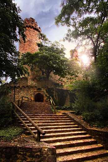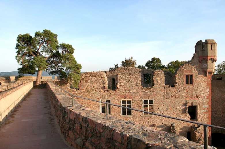Vom Parkplatz Fürstenlager geht es wieder den L2 entlang. Hinunter nach Bensheim-Auerbach, von dessen Ortsrand aus serpentinenförmig und steil aufwärts zum Auerbacher Schloss – dem Highlight der Wanderung. Eine Besichtigung des Schlosses lohnt sich – in jedem Fall aber bietet es einen imposanten Fernblick bis jenseits der Rheinebene.