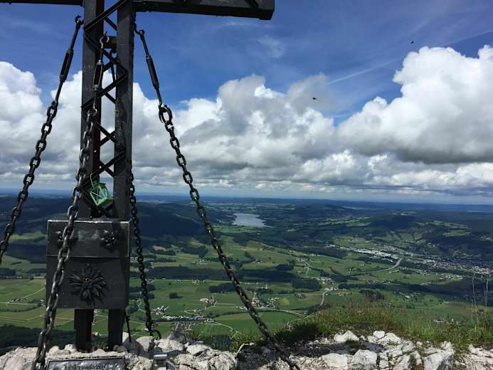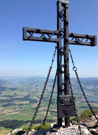Beim Gipfelkreuz angekommen hat man bei Schönwetter einen herrlichen Rund-um-Blick auf die Seen und Berge des Salzkammerguts. Wie viele Seen zu sehen sind, ist, abgesehen von der Witterung, vom mehr oder weniger guten Auge des Betrachters abhängig.