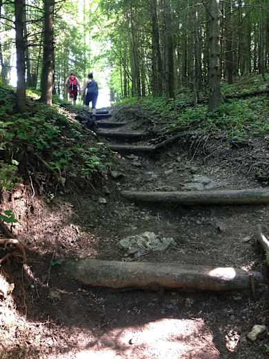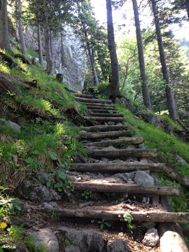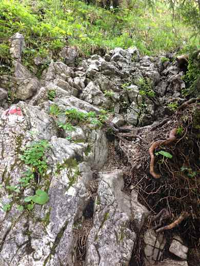 Weiter führt der Weg durch den Wald über vielen Stufen auf den Schober. Mit zunehmender Höhe wird der Weg anspruchsvoller und steiler. Einige kurze Stellen sind seilgesichert und mit Eisentritten versehen. Zwischendurch bieten sich immer wieder schöne Aussichten für einen kurzen Fotostopp an.