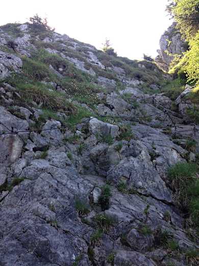 Kurz vor dem Gipfel gilt es die anspruchsvollste Passage der Tour zu bewältigen: ein kurzer Aufstieg über eine Eisenleiter gefolgt von einem drahtseilversicherten Steig durch die schroffe Felswand. Hier heißt es die Hände zu Hilfe nehmen, um über die großen Felsblöcke das Gipfelkreuz zu erreichen.