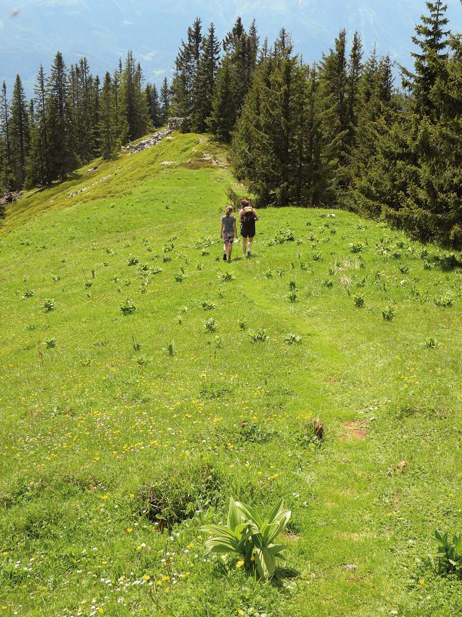 Der Weg führt über die Wiesen des Hochplateaus durch einen Zaundurchgang und schon bald in den Wald wo es ein schmaler, etwas steilerer Steig wird, aber gut markiert und nicht zu verfehlen ist. Nach einer knappen Stunde Aufstieg durch den offenen Wald zieht sich der Weg nach links über den Wiesenkamm zum Gipfel des Spielkogels (1.731 m).