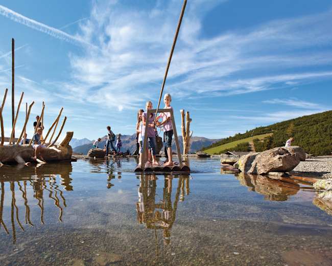 Wie im Bergwelten-Tipp erwähnt ist dieser in 4 Abschnitte geteilt. Die erste Teilstrecke , die von der Bergstation bis zur Pfnatschalm führt, befasst sich mit dem Thema Wasser. Kinder können sich mit Wasserrädern und Wasserläufen unterhalten sowie einen Teich auf einem Holzfloß überqueren.