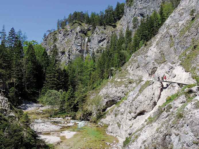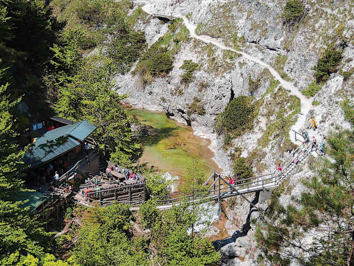 Vom Schutzhaus Abstieg durch den steilen Greimelgraben zum Greimelsteg (752 m, 20 bis 30 min, links auf dem markierten Weg zum Schleierfall und retour, zusätzlich 20min). Nun gleich durch eine besonders eindrucksvolle Engstelle zwischen hohen Dolomitfelsen am Ötscherbach talabwärts entlang.
