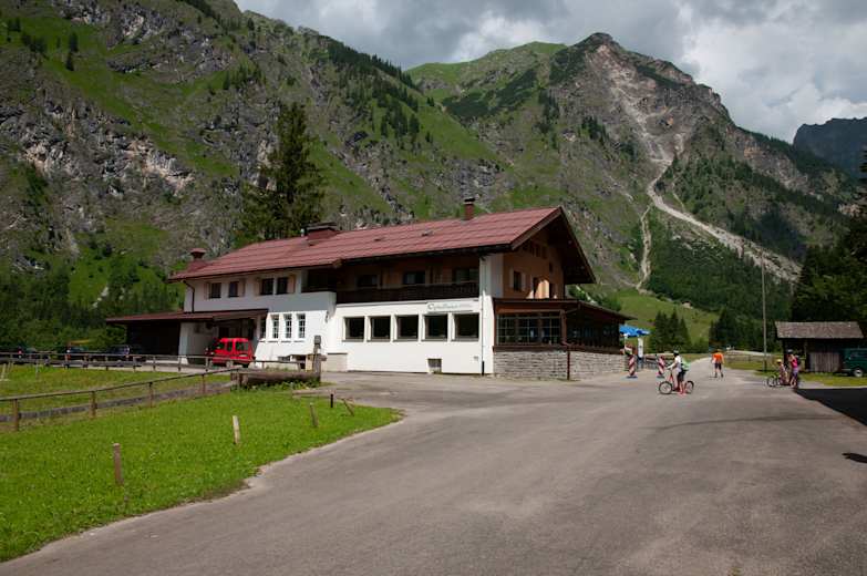 Auf der östlichen Seeseite beginnt der Gleitweg, der hinab ins Oytal führt. Über den extrem steilen Hang führt der Steig in vielen Kehren abwärts. Der Pfad ist teilweise ausgesetzt und erfordert Vorsicht und Trittsicherheit. Man erreicht den Talboden und geht in wenigen Minuten hinüber zum Oytalhaus, 1.009m.
