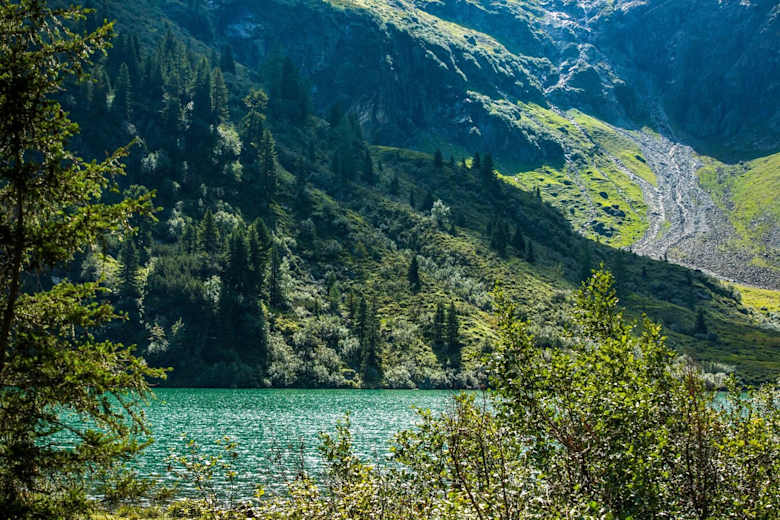 Hinter der Hütte führt der Weg leicht abfallend am Westufer des Hüttensees entlang. Durch Büsche und Erlengestrüpp geht es nach dem ersten See über eine grasbewachsene Geländestufe hinauf zum zweiten See, dem Obersee. Von rechts oben stäubt die Gischt des Schleierwasserfalls auf uns herab. Nur wenige Schritte und wir sind am Ufer des verträumten Obersees angelangt. Zurück geht es auf dem bereits bekannten Weg.