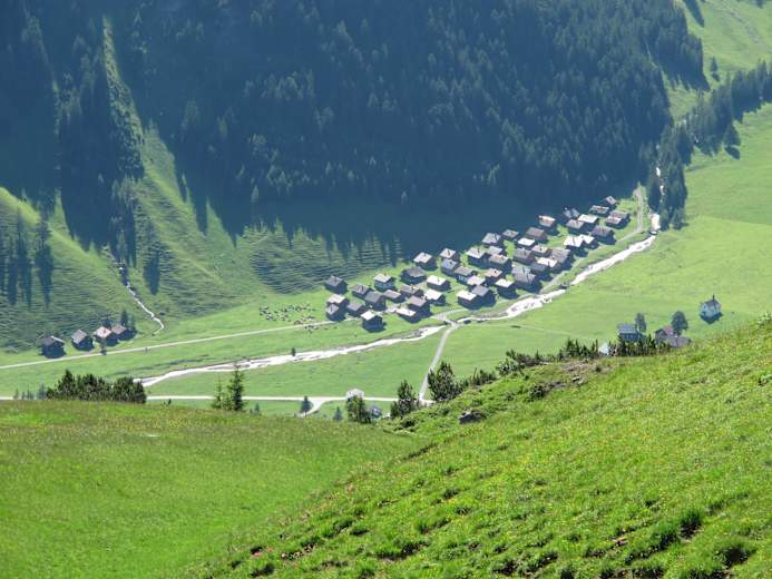 Über den Innersten Hof der ehemaligen Walsersiedlung steigt man nach Kühbruck hinunter. Auf der Alpstraße erreicht man schließlich das Ziel dieser Etappe, den Nenzinger Himmel.