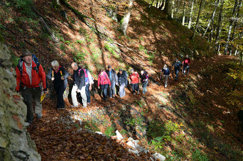 Der Weg schlängelt sich auf alten Pfaden hinauf zu einem Felsriegel (mit Informationstafel über die Waldtypen am Buchensteig). Die Hänge werden steiler und der Buchensteig entwickelt sich hier mehr und mehr zum alpinen Steig (Achtung Rutschgefahr!).