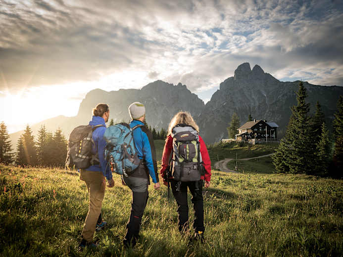 Von der Hinteren Flitzenalm geht es abwechselnd auf Steigen und Forststraße zur Mödlingerhütte (1.523m) hinauf. Sie liegt landschaftlich eindrucksvoll am Rücken der Treffneralm und der Rundumblick auf die Gipfel von Großen Ödstein, Admonter Reichenstein und Sparafeld ist fantastisch.