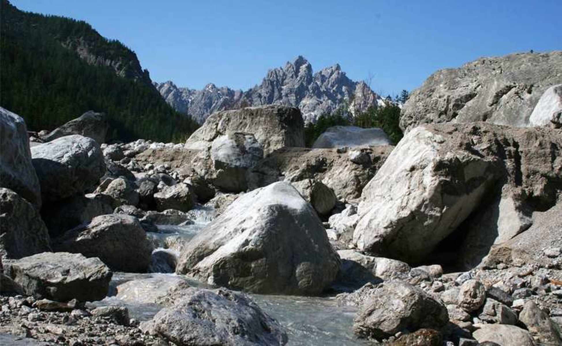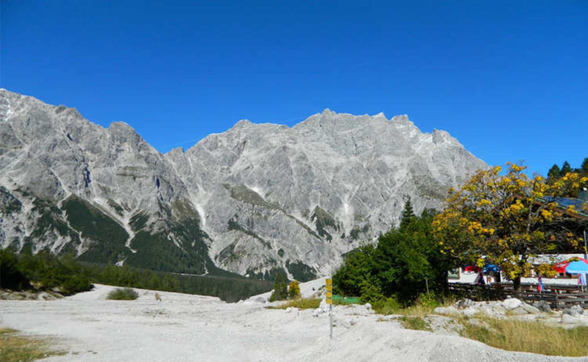 Beide Wege treffen einander wieder nach dem Ende der Klamm und führen entlang des Wimbachs aufwärts. Das Tal weitet sich nach einer Brücke (nicht folgen, da Sackgasse) und der breite Schuttstrom des Wimbachgrieses offenbart sich dem Wanderer.
