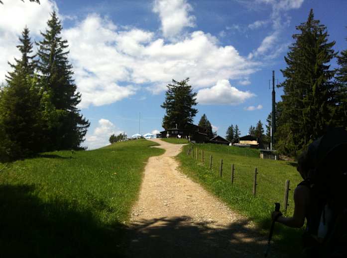 Rund 30 Minuten vor dem Gipfel teilt sich der Weg: Geradeaus geht es auf breitem Forstweg mit kurzen steileren Passagen weiter, wer rechts abbiegt, wählt eine kürzere, aber durchgängig steile Variante, die festes Schuhwerk und Trittsicherheit auf dem verwurzelten, steinigen Pfad voraussetzt. Oben lichtet sich der Wald, dann erreicht man einen Zaun mit Durchgang. Nach diesem geht es rechts, kurz darauf erreicht man die Neureuth. Dort angekommen, sucht man vergeblich nach einem Gipfelkreuz. Dafür gibt es einen schöne Kapelle und eine bestens bewirtschaftete Berggaststätte (Montag Ruhetag, bei schönem Wetter gibt es einen Kiosk).