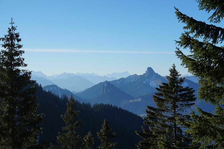 Bei stabilem Wetter kann man hier oben häufig Gleitschirmflieger beim Start beobachten. Beim Gipfelanstieg sind Trittsicherheit und festes Schuhwerk gefragt. Wer sich links neben den Felsen hält, ist auf einfacherem Weg zum Gipfelkreuz unterwegs – aber auch hier ist Vorsicht geboten und Selbstüberschätzung fehl am Platz. Vom Gipfel hat man nun eine tolle Aussicht im Norden über den Tegernsee und im Süden in die weite Bergwelt.