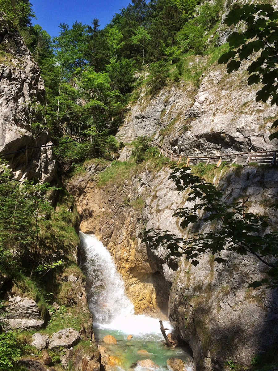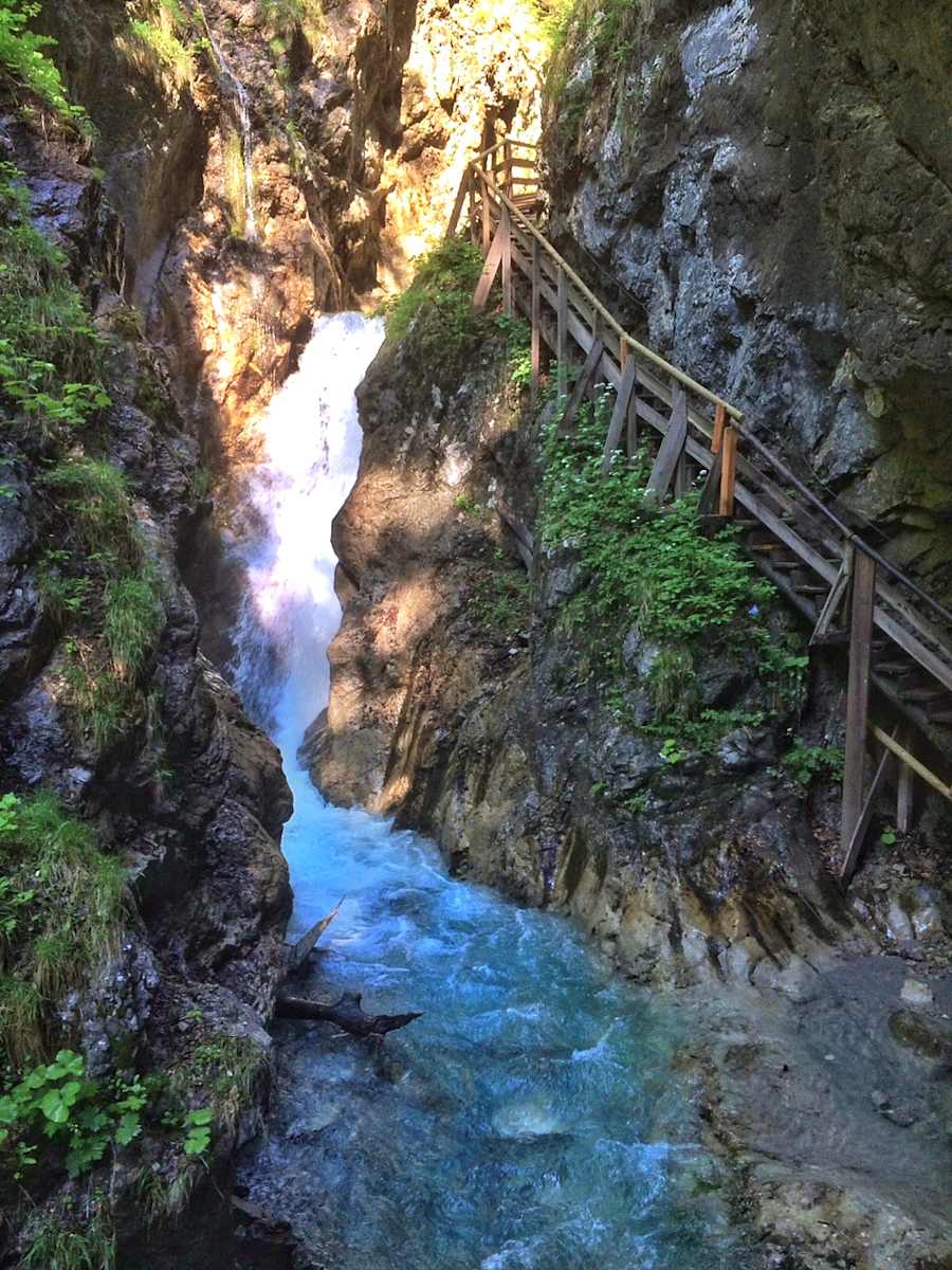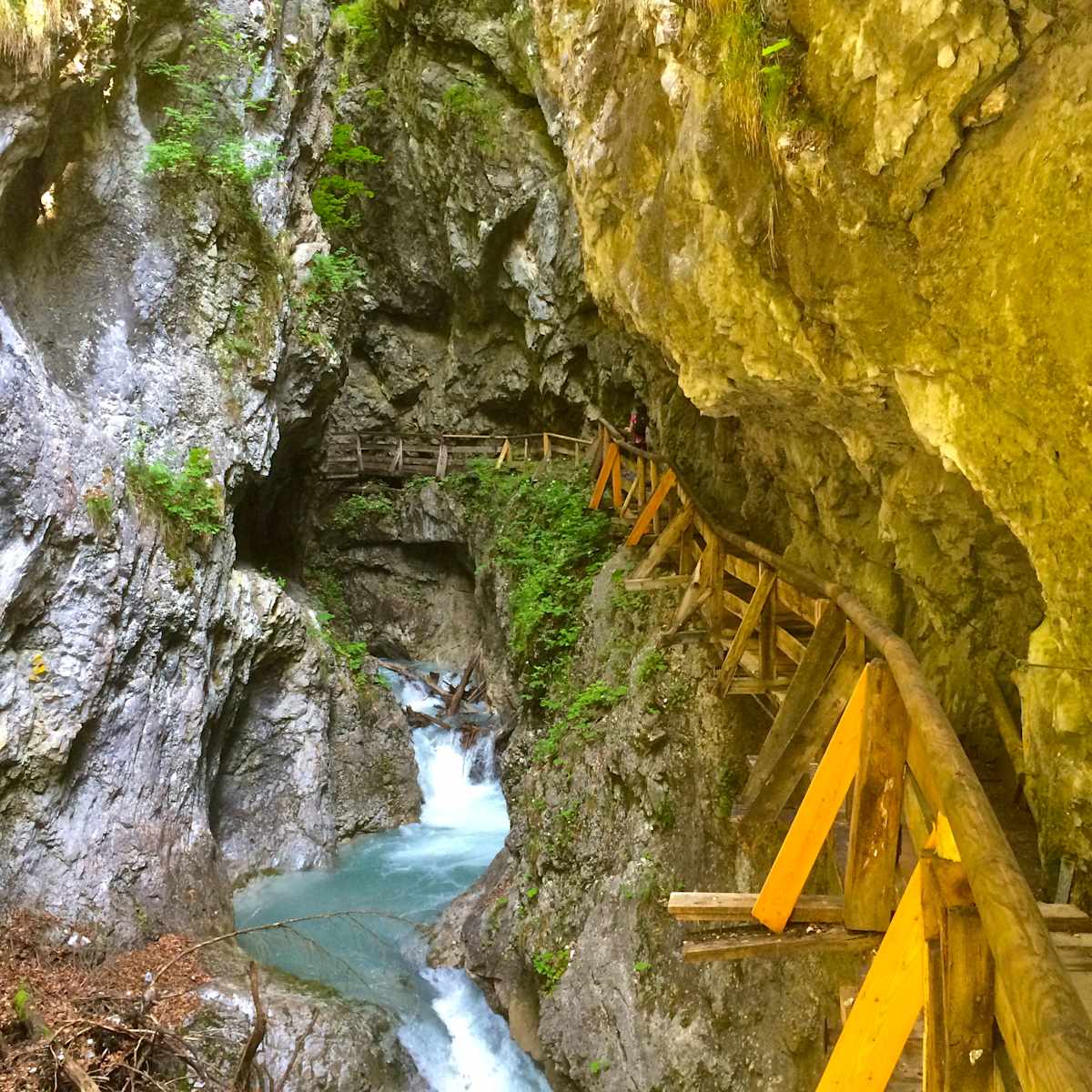 Schon kurz nach dem Einstieg geht‘s los: Die gut gesicherte Klamm im Karawendelgebirge mit ihren attraktiven Brücken und Stegen macht eine Schluchtenexpedition zum Erlebnis. Stiegen führen wie in einem Kirchturm nach oben. Immer entlang des tosenden, in reinstem Türkis daherbrausenden Wassers.