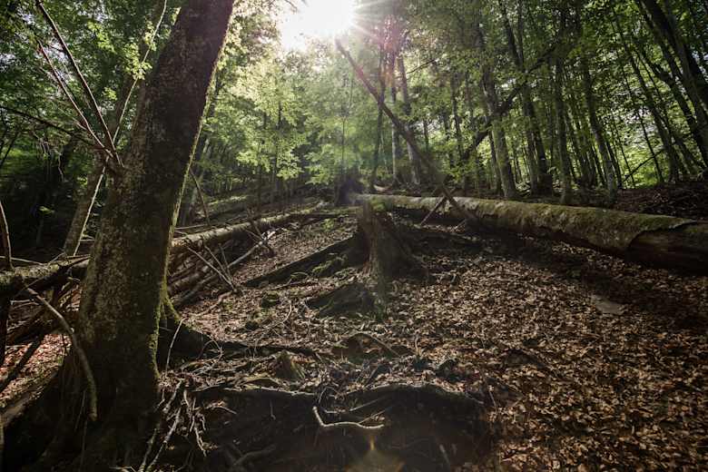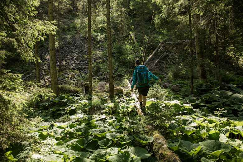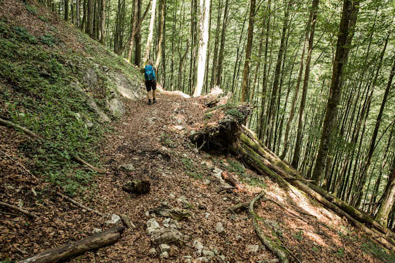Am Begsteigersteig kann man so gut wie nirgendwo sonst den Urwaldcharakter des Hintergebirges erleben. Das heißt aber auch: hier muss über Baumstämme geklettert werden und durch Brombeersträucher und Brennnesseln gewandert werden. Lange Hosen ersparen Kratzer!