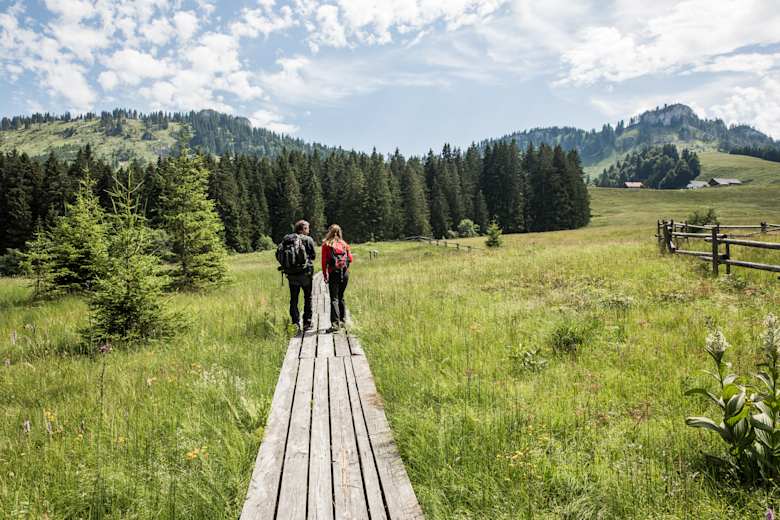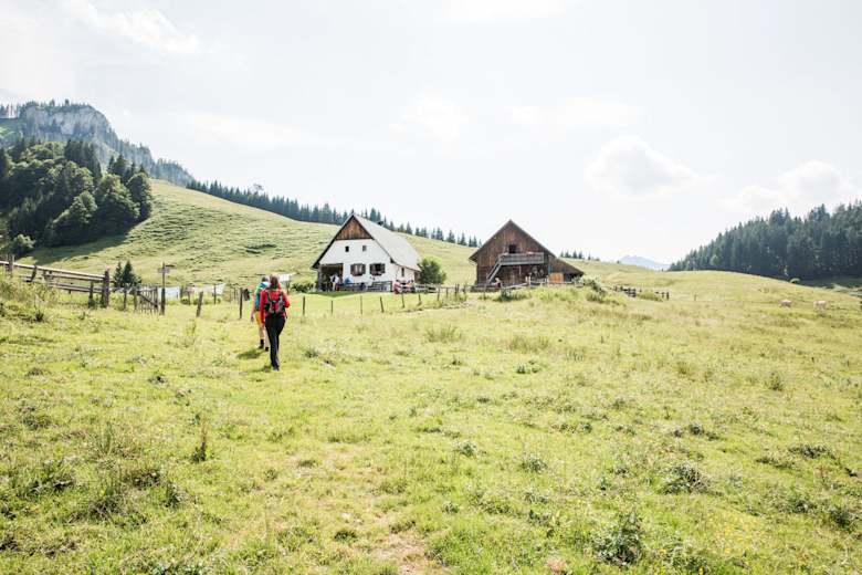 Jetzt ist es nicht mehr weit bis zur Forststraße, man folgt dem Weg 472 links und bei der nächsten Straßenkreuzung rechts und dann noch einmal links Richtung Ebenforst Alm. Das letzte Wegstück wandert man am Themenweg „Wollgras, Alm und Wasserschwinde“ vorbei an der Wasserschwinde und durch das Ebenforster Hochmoor bis zur idyllischen Ebenforstalm. Von hier aus könnte man noch den Gipfelsturm auf den Alpstein (1.443 m) wagen, den man von der Alm in ca. 45 Minuten erreicht.