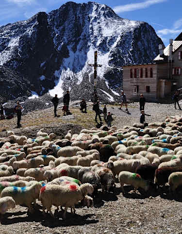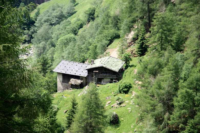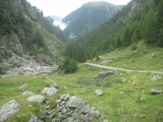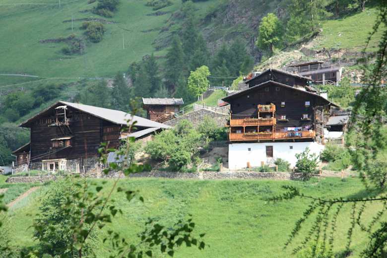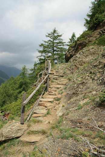 3. Etappe des Meraner Höhenweges: Vom Katharinaberg durch das wilde Pfossental bis zum Eishof (2.074 m). Auf der orographisch linken Talseite des Schnalstales wandert man über Stufen und Serpentinen zum Taleingang des Pfossentals, eines Seitentals des Schnalstals. Man erreicht die Höfegruppe und die Vorderkaser-Alm.