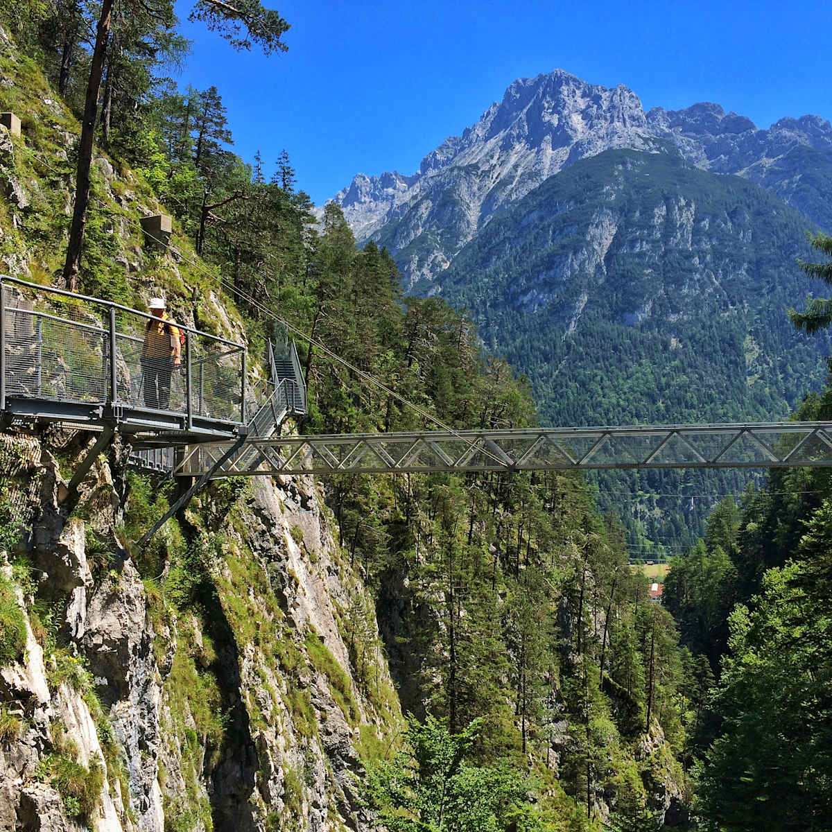Die Leutascher Geisterklamm in Mittenwald gehört wohl zu den beliebtesten Sehenswürdigkeiten in der Alpenwelt Karwendel. Mit großen Wasserfällen, blauen Gumpen und tiefen Schluchten sorgt eine Wanderung durch die Leutascher Geisterklamm nicht nur bei Kindern für große Begeisterung. Besonders beeindruckend sind die beiden Brücken, die über die Klamm führen und einen atemberaubenden Ausblick bieten.