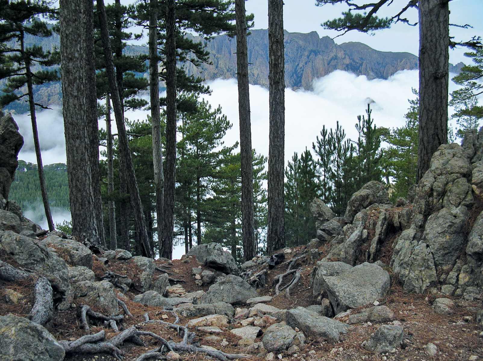 Am Brunnen führt eine Forststraße Richtung Osten. Dieser folgt man für 5 Minuten, bis die GR-20-Zeichen links durch den Wald hinunter in das Tal leiten. Man kommt über einen Bach und dann wieder auf eine Forststraße (1.020 m). Auf dieser geht man rechts, über den Volpajola-Bach. Achtung! Kurz danach zweigt der GR 20 rechts ab und führt in Serpentinen zur Foce Finosa (1.206 m) hinauf.