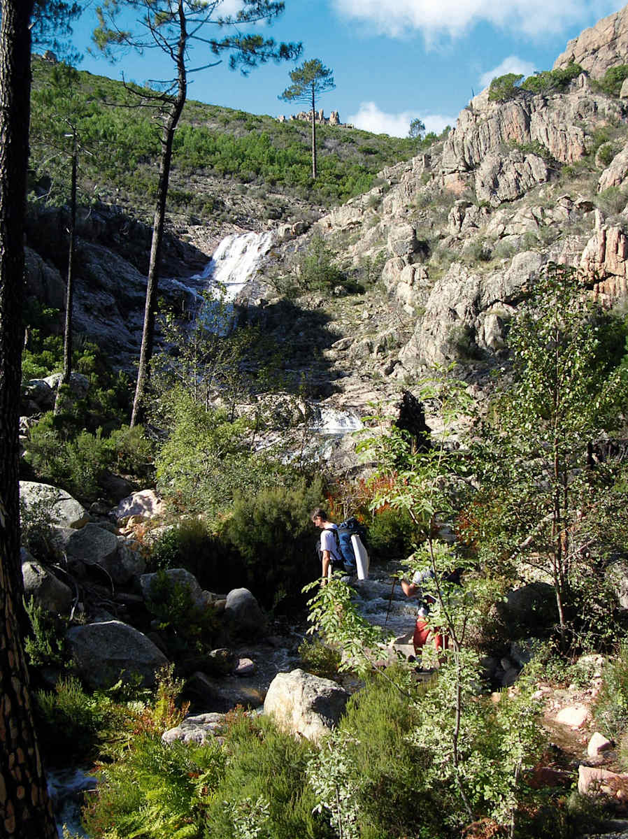Nach den Felsen kommt man durch die Macchia zu den Ruinen der Bergeries des Cabanes de Capeddu (850 m). Bei den Ruinen weist ein roter Pfeil nach links zu einer Quelle. Gut 400 m muss man auf dem Pfad nach Nordosten gehen, um das Wasser zu erreichen und findet die Quelle schließlich links vom Weg. In trockenen Zeiten findet man hier nur eine schwache Träufelquelle vor. Jedoch bietet sich dank eines Auffangbeckens auch dann die Möglichkeit die Trinkflasche aufzufüllen. Von den Ruinen der Bergeries de Capeddu führt der GR 20 erst weiter in Richtung Südosten und wendet sich dann nach etwa 1 km nach Osten. Man überquert den Rau de Punta Pinzuta in 600 m Höhe und geht am linken Ufer des Baches wieder nach Süden. Der Bach fließt aber dann nach Osten, man muss ihn erneut queren und findet ein paar Schritte oberhalb der Furt (550 m) schöne übereinanderliegende Gumpen, in denen am Nachmittag im Sommer Badetemperaturen von bis zu 34° C erreicht werden!